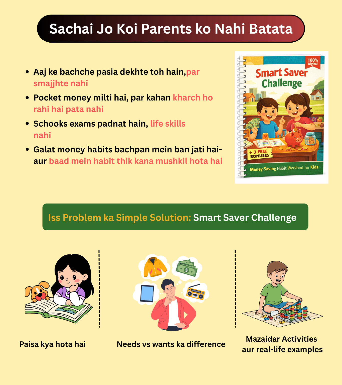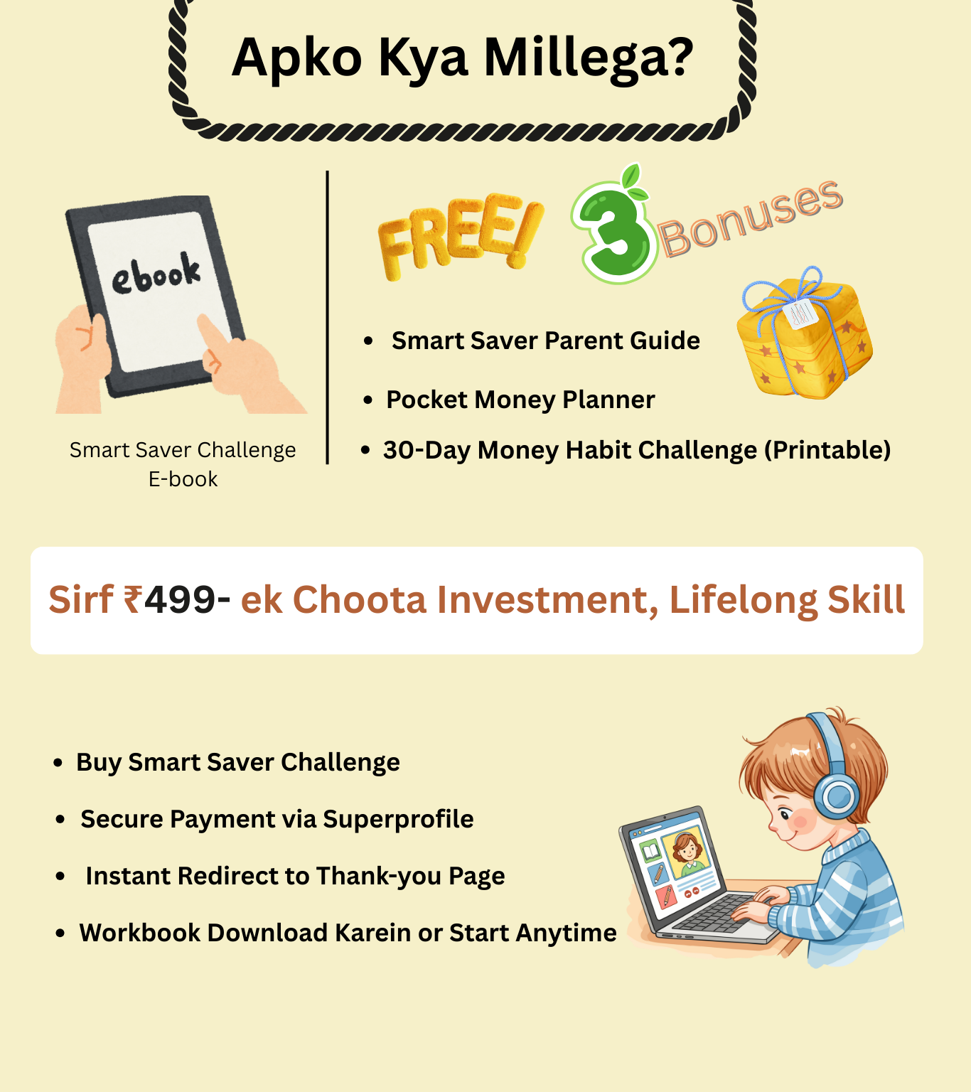 BookVibe5 (A Digital Products Gallery) Smart Saver Challenge @ ₹499 Get Instant Access @ ₹ 499 Kya ye Kids ke liye boring hoga? No. ye Activity-based hai, lecture based nahi. Kya mobile pe use ho sakta hai? Yes, Fully Mobile friendly hai. Kya parents ko Sath mein baithna padega? Shuru ke kuch activities mein guidance chahiye, baki self kar sakte hai.